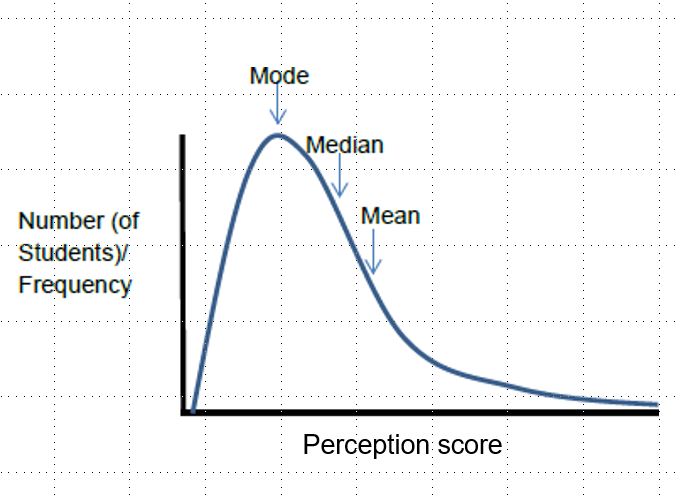 A positive skew indicates few high scores, and lots of low scores. Imagine I set you a really difficult test in which most of you got low marks with only a few of you getting high marks. In the case of a positive skew, the mode is at the highest point, then the median. The mean has been dragged to the right due to extreme scores.