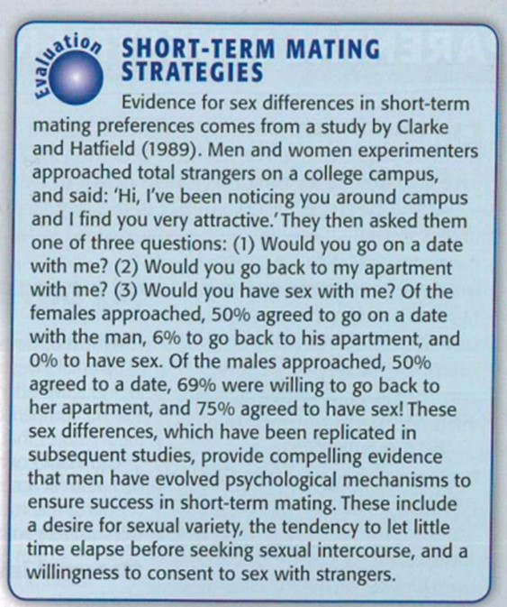 Basically, a good way of remembering everything covered so far is that according to the evolutionary approach, women are genetically wired to be gold diggers and men are wired to cheat and sleep around!