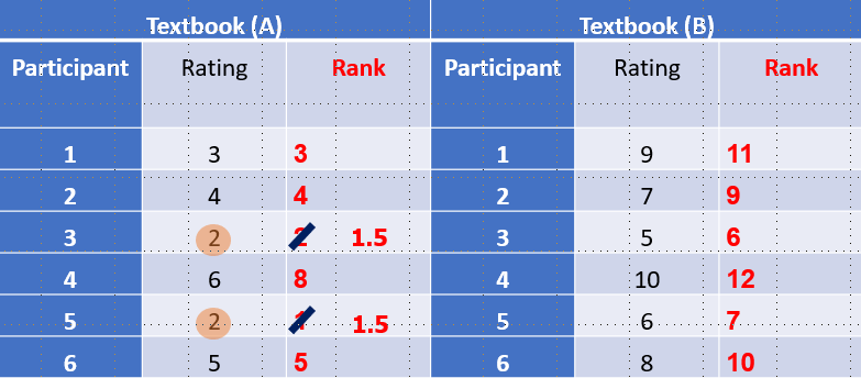 When looking at the rank scores, we can see that there are some scores are duplicated e.g. 2, 5, and 6. In such cases, you need to find the mean average of the ranks e.g. rating score “2” has been ranked as 1 and 2. Therefore, you add the ranks 1 + 2 = 3, then divide this by 2 = 1.5